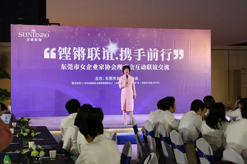 接下来,东莞市女企业家协会理事会会长叶小红女士上台发言,她表示非常感谢今年会集团集团举办此次联谊交流会,同时,对我们的产品和企业文化给出了很高的评价。她号召东莞市女企业家协会以后要更多的举办此类交流联谊活动,以此增进会员企业之间的联系和了解,为未来进一步交流发展开创新局面!她希望我们能携手同行,强强联手,共赢未来,共创新辉煌!